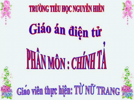 Giáo viên thực hiện: TỪ NỮ TRANG PHÂN MÔN : CHÍNH TẢ TRƯỜNG TIỂU HỌC NGUYỄN HIỀN Giáo án điện tử VIDEOS Chính tả nghe - viết Bài kiểm: (Chính tả nhớ-viết) Cao Bằng. - Em hãy nêu quy tắc viết hoa tên người, tên địa lí Việt Nam. - Viết lại những tên riêng trong đoạn thơ “Cửa gió Tùng Chinh”: Hai Ngàn Ngã Ba Pù Mo Pù Xai Thứ ba, ngày 15 tháng 02 năm 2011 Chính tả ( Nghe - viết) NÚI NON HÙNG VĨ Thứ ba, ngày 15 tháng 02 năm 2011 Chính tả ( Nghe - viết) NÚI NON HÙNG VĨ Vượt hai con sông hùng vĩ của miền Bắc, qua đất Tam Đường núi nhu nhú như chín mươi chín cái bánh bao tày đình, băng qua dãy Hoàng Liên Sơn hiểm trở, chọc thủng xong mấy dặm sương mù buốt óc thì lồ lộ bên phải là đỉnh Phan-xi-păng. Mây Ô Quy Hồ đang đội mũ cho Phan-xi-păng. Hết đèo Ô Quy Hồ là qua Sa Pa, thẳng ruổi về thành phố biên phòng Lào Cai. Theo Nguyễn Tuân . Thứ ba, ngày 15 tháng 02 năm 2011 Chính tả ( Nghe - viết) NÚI NON HÙNG VĨ Vượt hai con sông hùng vĩ của miền Bắc, qua đất Tam Đường núi nhu nhú như chín mươi chín cái bánh bao tày đình, băng qua dãy Hoàng Liên Sơn hiểm trở, chọc thủng xong mấy dặm sương mù buốt óc thì lồ lộ bên phải là đỉnh Phan-xi-păng. Mây Ô Quy Hồ đang đội mũ cho Phan-xi-păng. Hết đèo Ô Quy Hồ là qua Sa Pa, thẳng ruổi về thành phố biên phòng Lào Cai. Theo Nguyễn Tuân . Tại đây, các con Tại đất Tây Nguyên ông bà mình này Nơi mẹ đã đẻ ra ta và cắt rốn ta bằng cây nứa Chỗ tuổi nhỏ ta nằm nước bò qua bụng đỏ Và gió cao nguyên thổi nhột lỗ tai non. Chính nơi đây các con Xưa Đăm Săn, Y Sun, ông nội ta và lũ làng Đã rèn dao và mài gươm dưới trăng trong suốt Trong rừng già Mơ-nông, mặt trời không xuống đất Vẫn thanh đoản kiếm xưa Đăm Săn đuổi giặc Nơ Trang Lơng, A-ma Dơ-hao, cha ta và lũ làng mài gấp Hai mươi năm cạn nước sông Ba. Theo PRÊ KI MA LA MÁC Bài 2: Tìm các tên riêng trong đoạn thơ sau: Ai từng đóng cọc trên sông Đánh tan thuyền giặc, nhuộm hồng sóng xanh ? Vua nào thần tốc quân hành Mùa xuân đại phá quân Thanh tơi bời ? Vua nào tập trận đùa chơi Cờ lau phất trận một thời ấu thơ ? Vua nào thảo Chiếu dời đô ? Vua nào chủ xướng Hội thơ Tao Đàn ? Theo Trần Liên Nguyễn TRÒ CHƠI: ĐỐ BẠN 1. Ai từng đóng cọc trên sông Đánh tan quân giặc, nhuộm hồng sóng xanh ? Ngô Quyền(938), Lê Hoàn(981), Trần Hưng Đạo(1288 ). 2. Vua nào thần tốc quân hành Mùa Xuân đại phá quân Thanh tơi bời ? Vua Quang Trung (Nguyễn Huệ). 3. Vua nào tập trận đùa chơi Cờ lau phất trận một thời ấu thơ ? Đinh Tiên Hoàng (Đinh Bộ Lĩnh). 4. Vua nào thảo Chiếu dời đô ? Lý Thái Tổ (Lý Công Uẩn ). 5. Vua nào chủ xướng Hội thơ Tao Đàn ? Lê Thánh Tông (Lê Tư Thành). Lê Hoàn Ngô Quyền Trần Hưng Đạo Đinh Tiên Hoàng Vua Quang Trung Lý Thái Tổ Lê Thánh Tông Dặn dò : Chuẩn bị bài : Chính tả ( Nghe – viết) “ Ai là thủy tổ loài người” Trang 70 Kính chúc quý thầy, cô nhiều sức khỏe Chúc các em chăm ngoan, học giỏi
