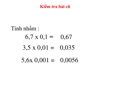 Tính nhẩm : 6,7 x 0,1 = 3,5 x 0,01 = 5,6x 0,001 = 0,67 0,035 0,0056 Kiểm tra bài cũ Toán Luyện tập Bài 1 : a)Tính rồi so sánh giá trị của (a x b) x c và a x (b x c ) a b c (a x b) x c a x (b x c) 2,5 3,1 0,6 1,6 4 2,5 4,8 2,5 1,3 (2,5 x 3,1) x 0,6 = 2,5 x (3,1 x 0,6) = 1,6 x (4 x 2,5) = 16 4,8 x (2,5 x 1,3) = 15,6 (1,6 x 4) x 2,5 = 16 (4,8 x 2,5) x 1,3 = 15,6 Luyện tập - Giá trị của (a x b ) x c và a x (b x c ) như thế nào khi thay các chữ bằng số ? Giá trị của hai biểu thức này luôn luôn bằng nhau. ( a x b ) x c = a x ( b x c ) 4,65 4,65 ? ? Bài 1 : a)Tính rồi so sánh giá trị của (a x b) x c và a x (b x c ) a b c (a x b) x c a x (b x c) 2,5 3,1 0,6 1,6 4 2,5 4,8 2,5 1,3 (2,5 x 3,1) x 0,6 = 4,65 2,5 x (3,1 x 0,6) = 4,65 1,6 x (4 x 2,5) = 16 4,8 x (2,5 x 1,3) = 15,6 (1,6 x 4) x 2,5 = 16 (4,8 x 2,5) x 1,3 = 15,6 ( a x b ) x c = a x ( b x c ) Phép nhân các số thập phân có tính chất kết hợp. Khi nhân một tích hai số với số thứ ba ta có thể nhân số thứ nhất với tích của hai số còn lại. Luyện tập b. Tính bằng cách thuận tiện: 9,65 x 0,4 x 2,5 7,38 x 1,25 x 80 = 9,65 x (0,4 x 2,5) = 7,38 x (1,25 x 80) = 9,65 x 1 = 9,65 = 7,38 x 100 = 738 0,25 x 40 x 9,84 34,3 x 5 x 0,4 =(0,25 x 40) x 9,84 = 34,3 x (5 x 0,4) = 10 x 9,84 = 98,4 = 34,3 x 2 = 68,6 Bài 2 : Tính a) (28,7 + 34,5) x 2,4 = 63,2 x 2,4 = 151,68 b) 28,7 + 34,5 x 2,4 = 28,7 + 82,8 = 111,5 Luyện tập Bài 3: Một người đi xe đạp mỗi giờ đi được 12,5km. Hỏi trong 2,5 giờ người đó đi được bao nhiêu ki-lô-mét? Bài giải Trong 2,5 giờ người đó đi được quãng đường là: 12,5 x 2,5 = 31,25 (km) Đáp số: 31,25 km