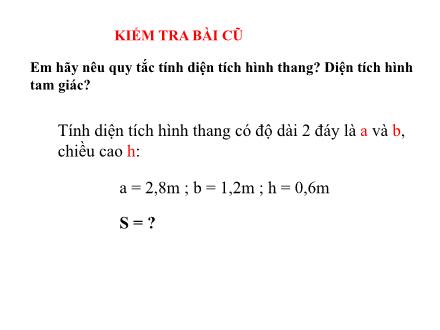 KIỂM TRA BÀI CŨ Tính diện tích hình thang có độ dài 2 đáy là a và b , chiều cao h : Em hãy nêu quy tắc tính diện tích hình thang? Diện tích hình tam giác? a = 2,8m ; b = 1,2m ; h = 0,6m S = ? Luyện tập chung Bài 1 : a/ 3 cm và 4 cm Tính diện tích hình tam giác vuông: S = 3 x 4 : 2 = 6 (cm 2 ) S = ? b/ 2,5 m và 1,6 m S = 2,5 x 1,6 : 2 = 2 (m 2 ) S = ? c/ S = ? dm và dm S = x : 2 = (dm 2 ) Luyện tập chung Bài 2 : A 1,6 dm B C E D H 1,2 dm 1,3 dm 2,5 dm S ABED > S BEC ? dm 2 Luyện tập chung Bài 2 : A 1,6 dm B C E D H 1,2 dm 1,3 dm 2,5 dm Diện tích của hình thang ABED là:(2,5 + 1,6) x 1,2 : 2 = 2,46 (dm 2 ) Bài giải Diện tích của hình tam giác BEC là: 1,3 x 1,2 : 2 = 0,78 (dm 2 ) Diện tích của hình thang ABED lớn hơn hình tam giác BEC là: 2,46 – 0,78 = 1,68 (dm 2 ) Đáp số : 1,68 dm 2 Luyện tập chung Bài 3 : 50 m 70 m a/ Diện tích của mảnh vườn hình thang là: (50 + 70) x 40 : 2 = 2400 (m 2 ) Bài giải Diện tích trồng đu đủ là: 2400 : 100 x 30 = 720 (m 2 ) Số cây đu đủ trồng được là: 720 : 1,5 = 480 (cây) Đáp số: a/ 480 cây 40 m Đu đủ: 30 % S Chuối: 25 % S a/ 1 cây đu đủ: 1,5 m 2 Vườn : ? cây b/ 1 cây chuối: 1 m 2 Chuối > đu đủ ? cây b/ Diện tích trồng chuối là: 2400 : 100 x 25 = 600 (m 2 ) Số cây chuối trồng được là: 600 : 1 = 600 (cây) Số cây chuối trồng được nhiều hơn số cây đu đủ là: 600 - 480 = 120 (cây) b/ 120 cây