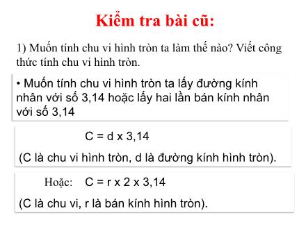 1) Muốn tính chu vi hình tròn ta làm thế nào? Viết công thức tính chu vi hình tròn. Muốn tính chu vi hình tròn ta lấy đường kính nhân với số 3,14 hoặc lấy hai lần bán kính nhân với số 3,14 C = d x 3,14 (C là chu vi hình tròn, d là đường kính hình tròn). C = r x 2 x 3,14 (C là chu vi, r là bán kính hình tròn). Hoặc: Kiểm tra bài cũ: 2) Một hình tròn có đường kính 3,5 cm. Tính chu vi hình tròn đó. Chu vi hình tròn đó là: 3,5 x 3,14 = 10,99 (cm) Đáp số: 10,99 cm Kiểm tra bài cũ: Toán 5 Luyện tập Bài 1 : Tính chu vi hình tròn có bán kính r: a) r = 9m b) r = 4,4dm Luyện tập c) r = 2 cm Chu vi hình tròn là: 9 x 2 x 3,14 = 56, 52(m ) Chu vi hình tròn là: 4,4 x 2 x 3,14 = 27,632(dm) Chu vi hình tròn là: 2,5 x 2 x 3,14 = 15,7(cm) Tính đường kính hình tròn có chu vi C = 15,7m C = d x 3,14 d = C : 3,14 Đường kính của hình tròn đó là: 15,7 : 3,14 = 5 (m) b) Tính bán kính hình tròn có chu vi C = 18,84dm C = r x 2 x 3,14 r = C : (2 x 3,14) Bán kính của hình tròn đó là: 18,84 : 2 : 3,14 = 3 (dm) Bài 2 : Luyện tập Hay r = C : 2 : 3,1 4 Hay r = C : 314 : 2 r = d : 2 Bài 3 : Đường kính của một bánh xe đạp là 0,65m. a) Tính chu vi của bánh xe đó. b) Người đi xe đạp sẽ đi được bao nhiêu mét nếu bánh xe lăn trên mặt đất được 10 vòng, được 100 vòng? Luyện tập a) Chu vi của bánh xe đạp là: 0,65 x 3,14 = 2,041 (m ) b) Số mét người ấy đi được nếu bánh xe lăn 10 vòng: 2,041 x 10 = 20,41 (m ) Số mét người ấy đi được nếu bánh xe lăn 100 vòng: 2,041 x 100 = 204,1 (m ) Đáp số: a) 2,041m b) 20,41m và 204,1m Bài giải Luyện tập Bài 4 : Khoanh vào chữ đặt trước Câu trả lời đúng: Cho nửa hình tròn H (xem hình vẽ). Chu vi hình H là: 18,84cm 9,42cm 24,84cm 15,42cm . Hình H 6cm